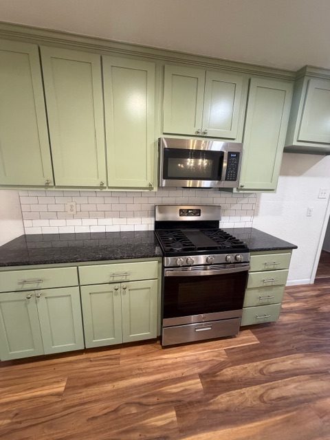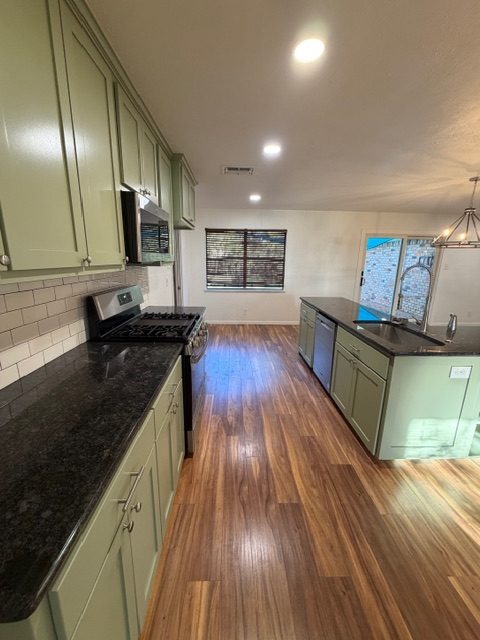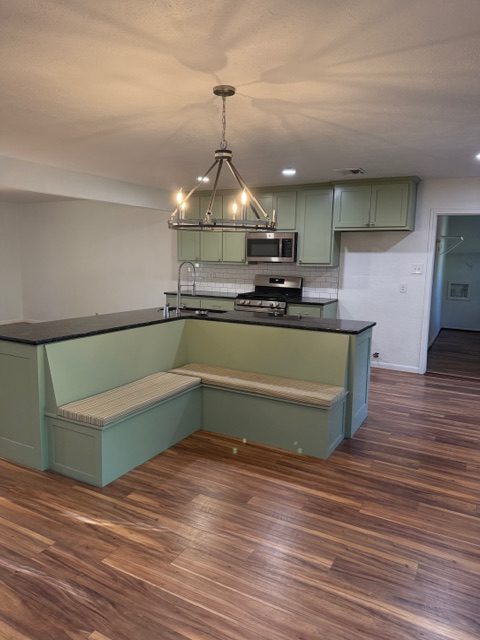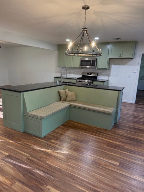 Inside, the home features an open floor plan, updated flooring, and a beautifully renovated kitchen equipped with stainless steel appliances, gas range, built-in glass washer at the sink, and a custom banquette with bench storage—ideal for kitchen appliances or seasonal items. A modern accent wall defines an additional flexible space perfect for a second living area or dining room.